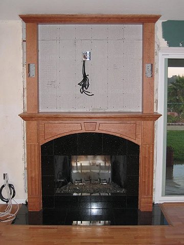Black Marble Face Fireplace and hearth - custom floor to ceiling wood mantel and surround